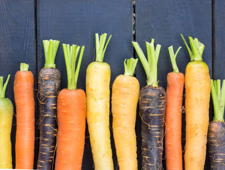 an arangment of freshly harvested heritage carrot varieties against a rustic dark grey wooden background