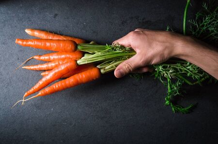 A man's hand holds fresh orange carrot. Photo with copy space. Healthy food and gardening concept
