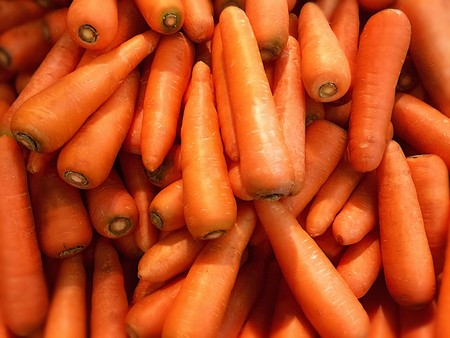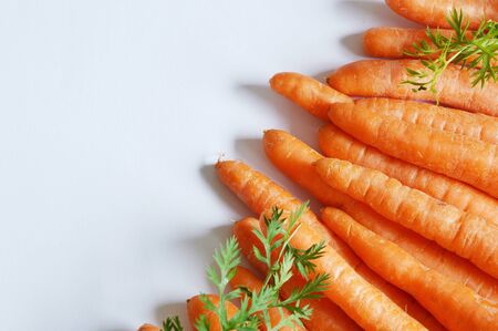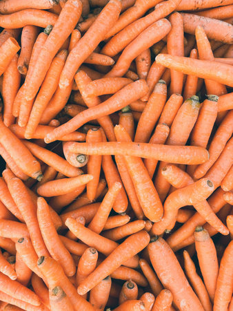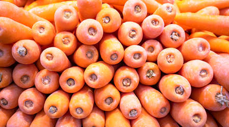Lots of carrots, top view. Benefits of carrots, washed carrots, vitamin A.