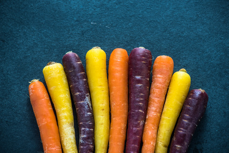 Rainbow carrots on dark slate background from above