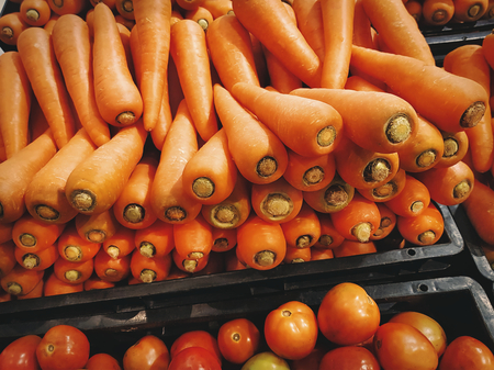 A lot of clean washed delicious ripe orange carrots are lying in the grocery store. A rich harvest of vegetables. Vegetarianism.