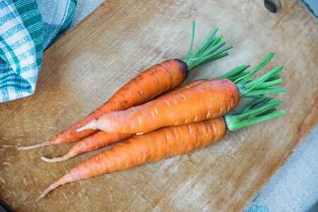 Fresh raw carrots on a wooden Kitchen cutting board. Vegetables from the garden