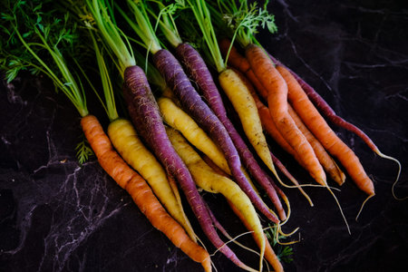 Colorful carrots, healthy vegetables on a black marble background