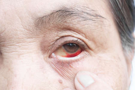 Closeup old woman with burst blood in eyes, health care and mdical concept