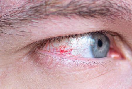 Close up of two annoyed red blood eyes of male affected by conjunctivitis or after flu, cold, allergy. Copy space for advertisement. Tired eyes after working at the computer. Close-up videos and macro