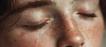 A detailed close-up image of closed eyes with a serene expression, highlighting soft eyelashes and freckles on the skin. The image conveys tranquility and calmness.