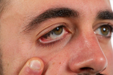 Eye injury, young man with burst blood vessel in eye, fatigue, problems with blood vessels