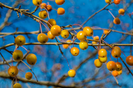 Pyracantha (Firethorn) branch with yellow berry-like pomes. Selective focus.