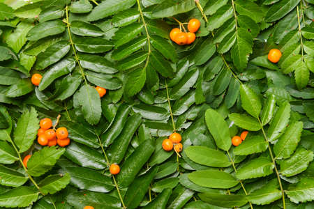 A closeup view of the bright orange ashberries with a sunlight streaming on them through the rowan leaves. Selective focus. Blurred green background