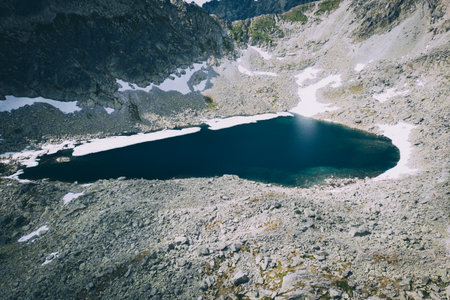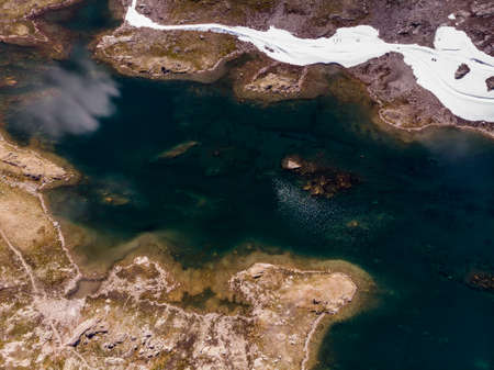 Aerial view. Clear blue water mountain tarn with stone rocky shore. Norwegian nature.