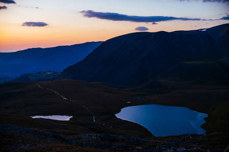 Atmospheric dawn landscape with two beautiful mountain lakes among dark mountain silhouettes and vivid orange gradient sky with lilac clouds of sunset. Dirt road along lake on mountain pass in sunrise