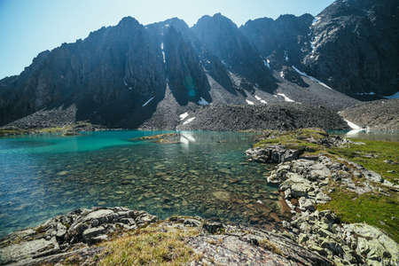 Sunny mountain landscape with azure glacial lake in sunlight. Turquoise clear water of mountain lake and big rock. Beautiful scenery with lake and snow in mountain. Stony bottom in transparent water.