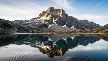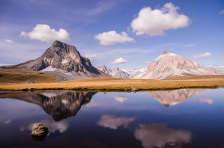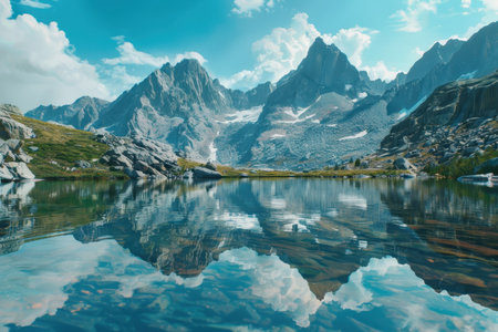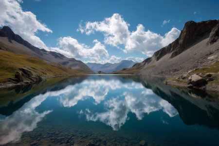 Breathtaking alpine scenery with a high altitude mountain lake perfectly reflecting the sky and clouds