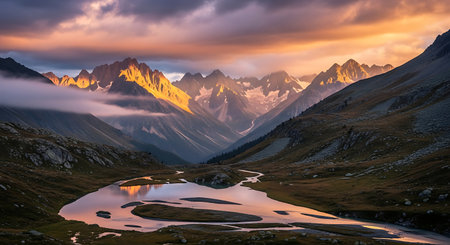 Mountain landscape with lake and snowcapped peaks in the clouds