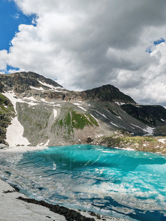 Alpine lake showcases vibrant turquoise water reflecting clouds and mountains, surrounded by snow patches and rocky terrain
