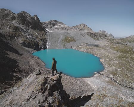 Landscape of Caucasus Dukka lake in mountain. Person and nature. Travel and relax scene.