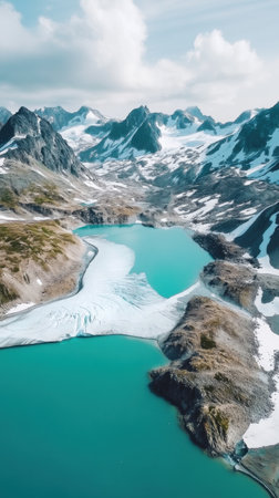 A stunning glacial lake with turquoise waters lies nestled among rugged mountains and glaciers. A dramatic landscape showcases nature's beauty in a serene and untouched wilderness.