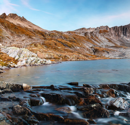 Mountain lake at sunset in the mountains of the Caucasus, Russia
