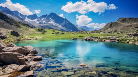 Tranquil alpine mountain lake landscape with serene reflection and clear blue sky surrounded by majestic mountains in untouched wilderness