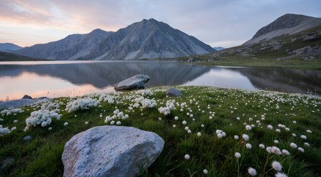 serene mountain lake with clear water, surrounded by green hills and purple wildflowers in the foreground