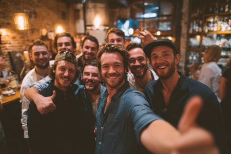 Young men are gathered together in a bar, smiling and posing for a selfie, capturing the essence of friendship and joy in a lively environment