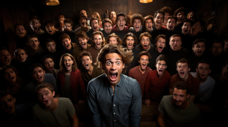 Three handsome men expressing strong emotions with fierce screams and clenched fists in an intense moment of camaraderie indoors