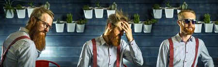 Portrait of bearded hipster with ginger hair in barbershop. Collage.