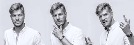 Portrait of a man with tree different emotional face expressions as a symbol of instat personality shifts. Concept of bipolar and borderline.