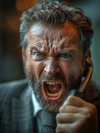 A man stares intensely at the viewer, his strong facial features accentuated by a thick beard and striking blue eyes. The backdrop is plain, enhancing the dramatic tension of his fierce expression, revealing deep emotions.