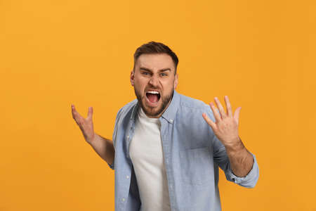 Frightened man. Emotion of fear. Scared screaming male, threaten concept