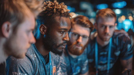 A competitive esports team discusses strategies with intense focus. The players, spotlighted by venue lights, are engaged in planning their next moves amidst a vibrant atmosphere.