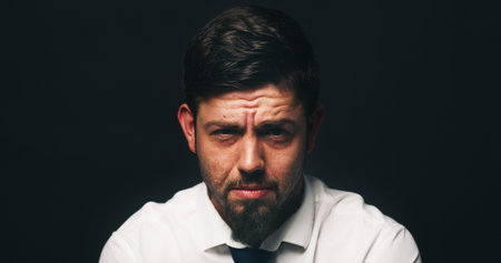 Businessman, portrait and sad with stress in studio, financial crisis and space on black background. Person, depression and frustrated with mental health, anxiety or anger with bankruptcy in Portugal