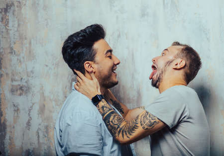 Caucasian gay couple kissing revealing a moments of sexual life, close up, isolated studio shot over grey concrete wall.