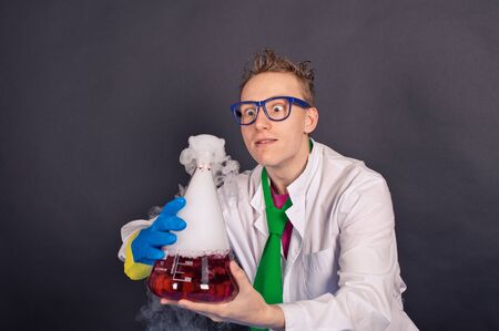 Explosion in the laboratory,funny crazy scientist boy working in a laboratory