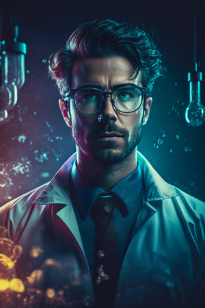 Portrait of young scientist, chemist or doctor conducts chemical research at pharmaceutical lab. Concept of chemistry, medicine.