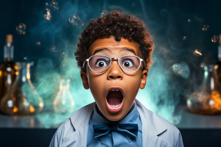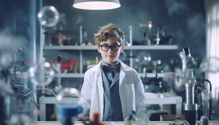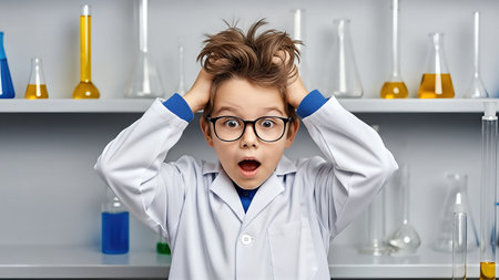 A young boy in a lab coat displays a surprised expression while holding his head in a chemistry classroom, surrounded by vibrant glassware and scientific instruments