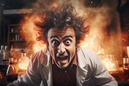 Eccentric shocked male scientist with tousled hair in laboratory, chemicals explosion in background