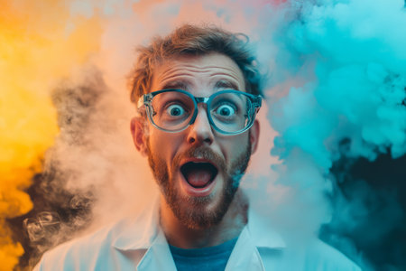 Surprised scientist with wide eyes and open mouth surrounded by vibrant clouds of colorful smoke