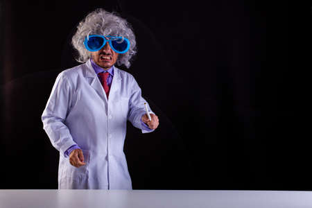 Crazy science teacher in white coat with unkempt hair in funny eye glasses holding a wand to point at the blackboard