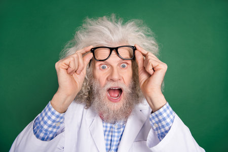 Photo of shocked amazed crazy old scientist physician having problem unbelievable research isolated on green color background