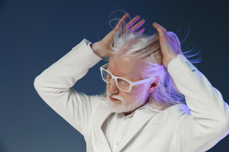 A man dressed as a scientist displays shock and excitement with wild hair and glasses, creating a playful and energetic atmosphere against a bright blue backdrop.