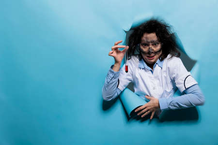 Insane biochemistry specialist with messy hair and dirty face grinning creepy while having glass test tube filled with chemical mix. Crazy chemist with wacky goofy look on blue background. Studio shot