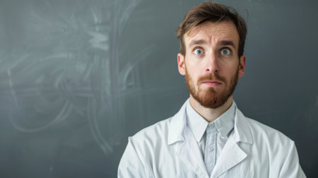 A surprised scientist with wild hair and large glasses shows shock in a laboratory setting, surrounded by a blackboard filled with complex scientific equations and notes.