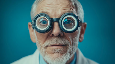 An elderly scientist with gray hair and a beard is wearing oversized goggles, looking curiously at the viewer in a brightly lit laboratory, creating an engaging and thought-provoking atmosphere.