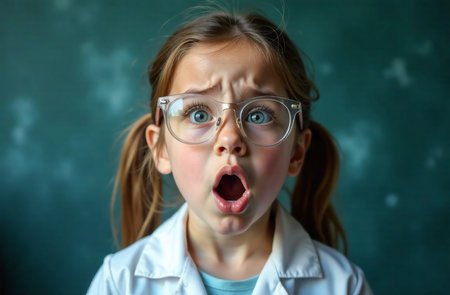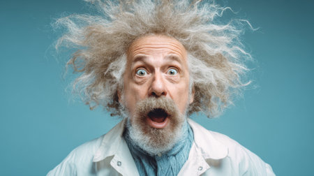 A scientist expresses astonishment with messy hair and wide eyes against a vibrant blue background.