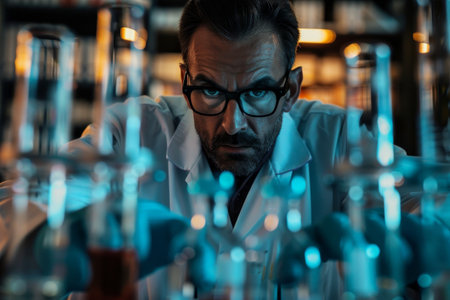 A man in a lab coat and glasses closely examines test tubes and equipment in a laboratory setting, A scientist surrounded by test tubes and equipment
