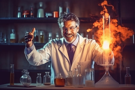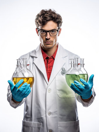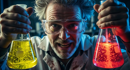Mad scientist showing mad scientist with yellow and red bubbling liquid in flasks. High resolution image suitable for commercial use. Clear details and vibrant colors enhance visual appeal.