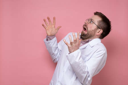 Frightened, amazed doctor in a white coat looks in fear and throws hands up. Copy space. Pink background.