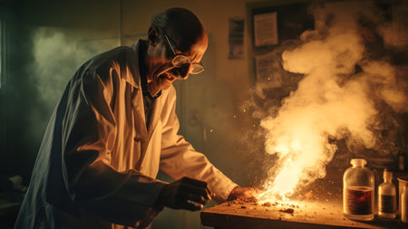 A clever chemistry professor obsessively conducts researches in the laboratory lit by yellow and green light.