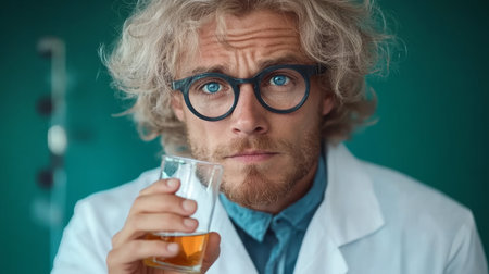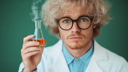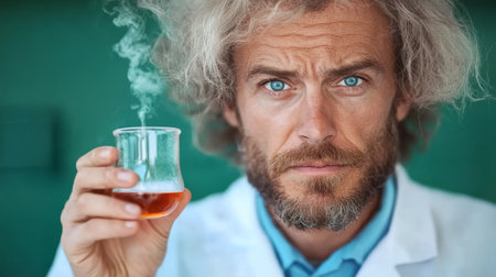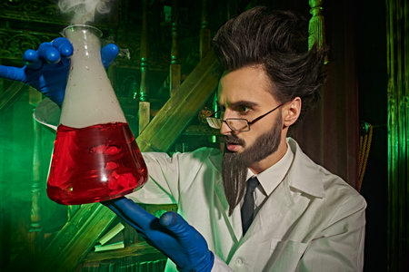 Insane lunatic chemist with wacky funny look holding test tube filled with blood sample after dangerouus chemical explosion in laboratory. Crazy mad biochemistry expert having glassware flask